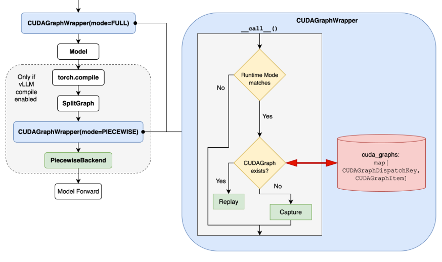 • CUDAGraphWrapper: wrapper that handles CUDAGraph capture & replay on the wrapped callable